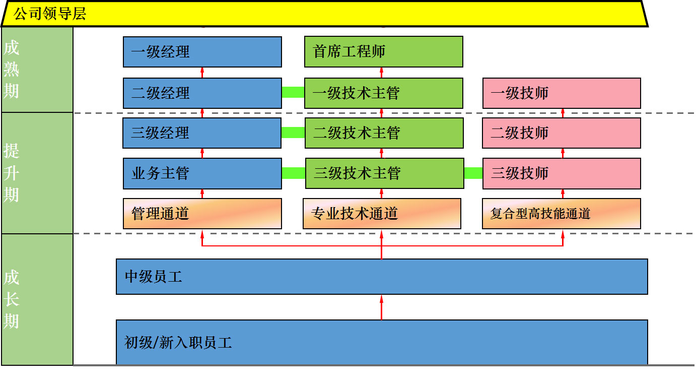 為鼓勵員工學習管理知識和專業(yè)知識,提高個人核心競爭力,引導員工通過自身不斷努力實現(xiàn)價值提升,公司為員工提供了多條職業(yè)發(fā)展通道,總體上劃分為管理通道、專業(yè)技術通道和復合型高技能通道三個序列。